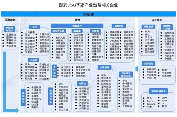 5G产业链条非常之广,含零部件、主设备、运营商和下游应用等环节。前期投入主要包括无线设备、传输设备、基站设备、小基站、光通信设备、网络规划实施等。从应用方向上看,5G应用包括产业数字化、智慧化生活、数字化治理三大方向;5G通用应用(即未来可能应用于各行业各种5G场景的应用)包括4K/8K超高清视频、VR/AR、无人机/车/船、机器人四大类;5G应用到工业、医疗、教育、安防等领域,还将产生X类创新型行业应用。