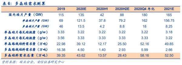 从需求端来看,根据我们测算,2020 年和 2021 年,多晶硅料需求总量为 43.62 万吨和 52.50 万吨,分别同比增长 10.8%和 20.4%。其中,2020 下半年,多晶硅料需求 28.43 万吨,环比上半年翻倍增长;而如果按照 2020Q4 年化 180GW 装机测算(单季度需求 45GW),多晶硅料年化需求将达到 58 万吨。