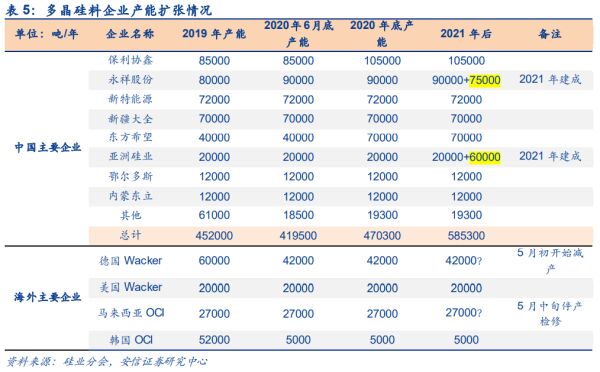 从供给端来看,相比 2019 年,2020 年国内多晶硅料新增产能有限,仅保利协鑫新增 2 万吨、 通威新增 1 万吨、东方希望新增 3 万吨,但由于上半年硅料价格持续下跌导致行业有约 4.2 万吨产能停产,同时海外产能也在陆续退出,德国 Wacker 和韩国 OCI 停产产能预计将达到 6.5 万吨,而展望 2021 年,除了通威股份有 7.5 万吨产能和亚洲硅业有 6 万吨产能将于 2021 年底建成以为,行业没有其他新增产能。相比今年上半年,行业预计新增多晶硅料产能 5 万吨,其中保利协鑫 2 万吨、东方希望 3 万 吨,但由于 7 月份以来,新疆地区多晶硅料产能接连发生事故,预计将影响多晶硅料产能 4-5 万吨至年底。另外,根据硅业分会数据,国内多晶硅产能中 49.1%集中在新疆,而目前新疆地区多晶硅料受疫情及检修自查等原因影响,出货受阻,预计将加剧多晶硅料供不应求的局面。