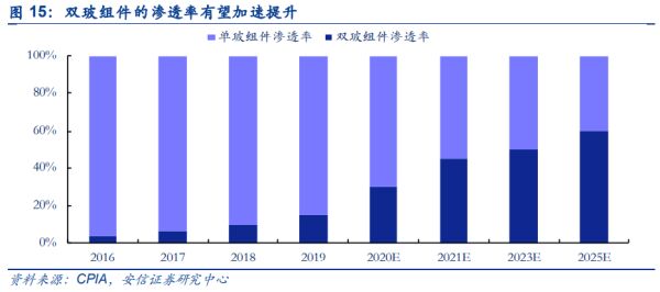 双玻组件渗透率有望快速提升。相比传统单玻组件,双面双玻组件在正面直接照射的太阳光 和背面接收的太阳反射光下,都能进行发电。双玻组件质保期长达 30 年,普通组件 25 年, 全生命周期内双玻组件的发电量比普通组件高出 25%左右,从 LCOE 角度性价比更高。过去双玻组件渗透率提升较慢的原因主要有两个:1)成本更高;2)质量更重。但随着 2.0mm 玻璃的推出,我们测算 72 片双玻组件质量 26.5kg,仅比常规单玻重 15%;且一套组件玻璃 +背板成本仅比常规单玻高 3.5 分。随着双玻性价比优势的凸显,今年双玻组件渗透率有望 加速提升,从去年的 15%提升到今年的 30%,未来 3-5 年有望提升至 60%以上。经测算, 双玻组件对光伏玻璃的需求量相比单玻组件可提高约 49%。