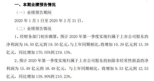 公告显示,业绩预告期间为2020年1月1日至2020年3月31日,预计2020年第一季度实现归属于上市公司股东的扣除非经常性损益的净利润为15.49亿元到18.49亿元,与上年同期相比,将增加9.53亿元到12.53亿元,同比增加159.90%到210.23%。