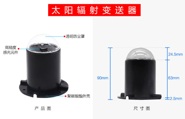 太阳总辐射变送器配置高精度的感光元件,宽光谱吸收,全光谱范围内吸收量高,稳定性好;在感应元件外安装透光率高达95%的防尘罩,罩体采用特殊处理,能减少灰尘吸附,有效防止环境因素对内部元件的干扰,可以较为精准的测量太阳辐射量。