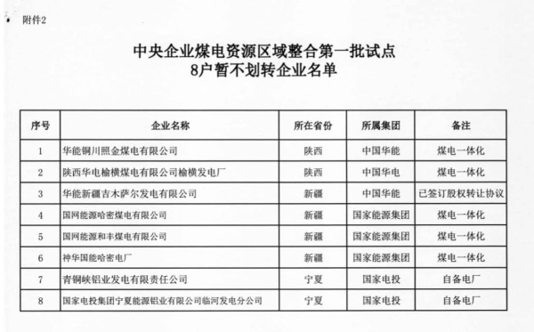 根据《通知》,8户暂不划转的企业(或项目)中,分别为5户煤电一体化项目、2户自备电厂、1户已签订转让协议。