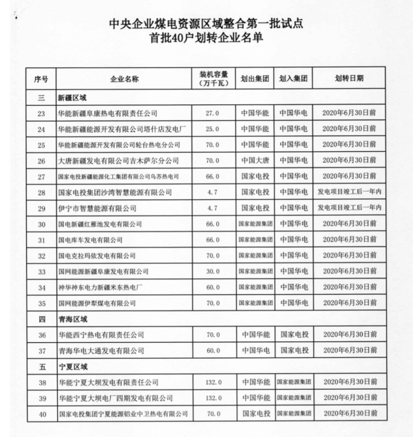 中国电力网讯 5月20日,国资委向五大发电集团下发了《关于印发中央企业煤电资源区域整合第一批试点首批划转企业名单的通知》(下称《通知》)。中国华能、中国大唐、中国华电、国家电投、国家能源集团根据《中央企业煤电资源区域整合试点方案》,将在甘肃、陕西、新疆、青海、宁夏5个试点区域开展第一批试点。第一批试点共涉及48户煤电企业(或项目),其中,38户将于2020年6月30日前划转、2户于发电项目竣工后一年内划转、8户暂不划转(5户煤电一体化项目、2户自备电厂、1户已签订股权转让协议)。