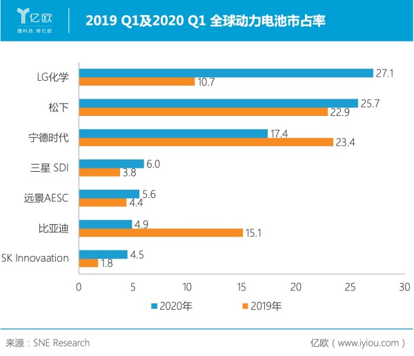 韩国调研机构SNE Research于5月7日发布的最新报告显示,2020年第一季度,全球电动汽车动力电池的市场份额的头名易主。
