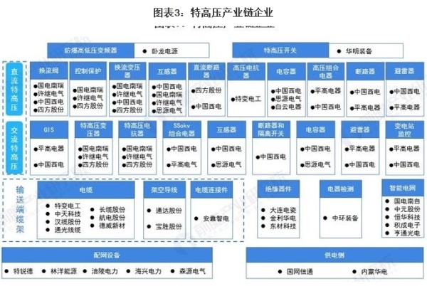 特高压相关产业链可以分为上游的电源控制端、中游的特高压传输线路与设备、下游的配电设备。其中特高压线路与设备是特高压建设的主体,可进一步分为交/直流特高压设备、缆线和铁塔、绝缘器件、智能电网等。