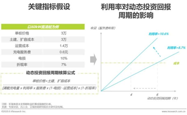 充电桩运营商盈利能力较弱已成为行业共识,目前仅特来电一家在2019年宣称跨过盈亏平衡线开始盈利。公共充电桩的盈利能力取决于单桩利用率和充电服务费两大因素,目前运营商的收入绝大多数来源于服务费的收取,模式较为单一。而激烈的竞争和用户对充电费用极为敏感导致服务费短时间内难以上升,因此单桩利用率成为目前运营商盈利的重中之重。经测算,在全国平均服务费为0.6元的情况下,利用率提升1.9%可以显著缩短两年的动态投资回报周期,而更加合理的选址布局和加大直流桩的投建为提升利用率的关键所在。