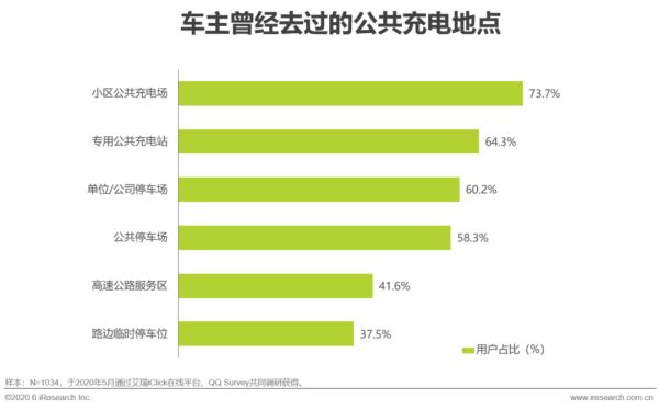 在所有公共充电桩建设场所当中,小区公共充电场、专用的公共充电站、单位或公司停车场和在商超、公园等地设立的公共停车场为大部分私家车主去过的充电地点。在高速公路服务区充过电的用户仅占41.6%;同时由于在路边车位停车时间久后易被罚款,仅37.5%的用户在此地点有过充电体验。同时,对于私家车用户而言,居住地点和办公地点为相对固定的充电场所。